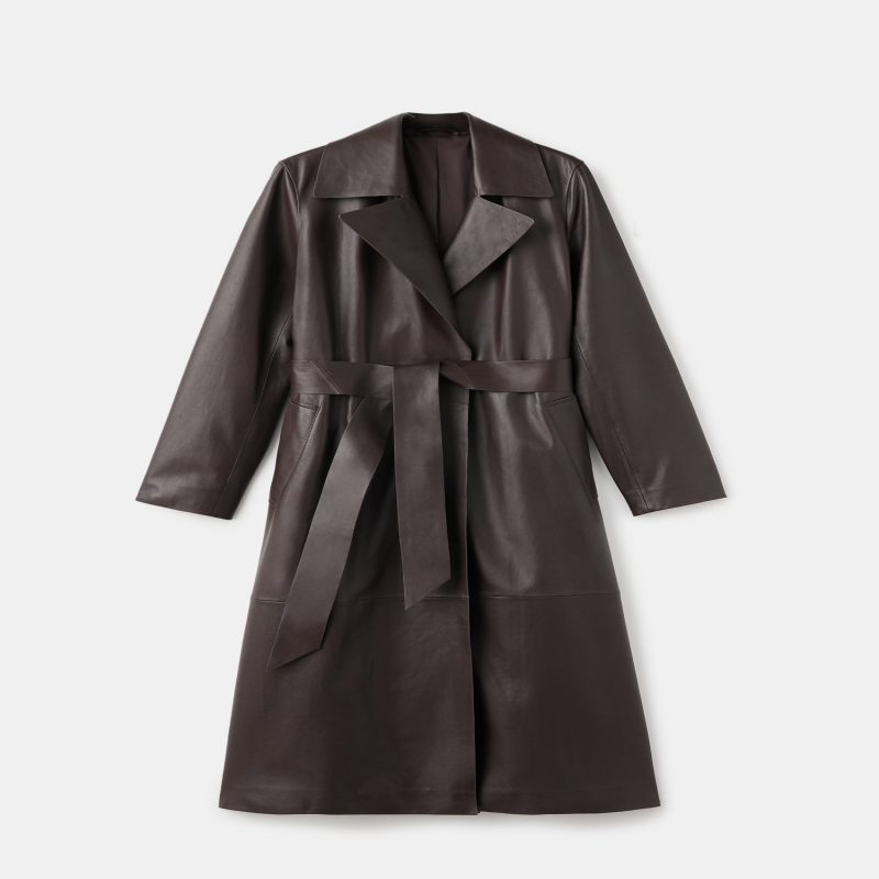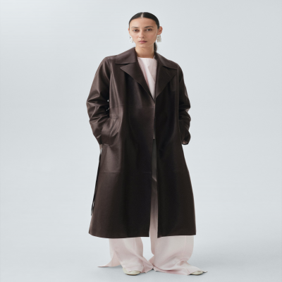 Confeccionado en 100% piel ovino, este trench presenta un diseño largo y oversize. Incluye cuello pico de solapa con muesca, manga larga, dos bolsillos laterales y cinturón tipo batín. Forro interior. Colección Selection