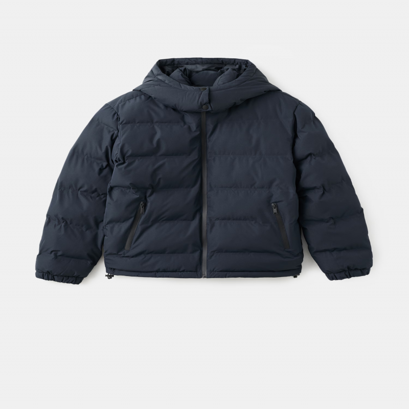 Tejido acolchado. Diseño recto. Con capucha. Manga larga con puños elásticos. Cierre delantero con cremallera. Dos bolsillos laterales.