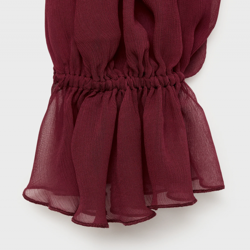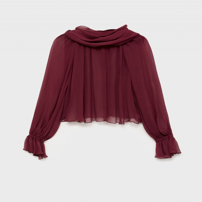 Confeccionada en tejido semitransparente, esta prenda presenta un diseño oversize con un cuello drapeado adornado con un fular. Las mangas largas tienen puños elásticos y el cierre de botón se encuentra en la parte posterior